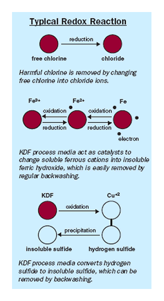 KDF Fluid Treatment's unique combination of copper and zinc creates an electro-chemical reaction. During this reaction, electrons are transferred between molecules, and new elements are created. Some harmful contaminants are changed into harmless components. Free chlorine, for instance, is changed into benign, water-soluble chloride, which is then carried harmlessly through the water supply. Similarly, some heavy metals such as copper, lead, mercury and others, react to plate out onto the medium's surface, thus being effectively removed from the water supply.