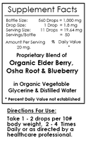 Premium organic American Elderberry glycerine extract in a delcious base of all-natural blueberry juice. Kids of all ages (including adults) love it! For protection or when symptomatic, take 1 drop per pound of body weight two (2) to six (6) times a day.