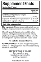 Lamb Pituitary/Hypothalamus Complex Concentrate (ovine), Superoxide Dismutase (from vegetable culture†), Catalase (from vegetable culture†) †Specially grown, biologically active vegetable culture containing naturally associated phytochemicals including polyphenolic compounds with SOD and catalase, dehydrated at low temperature to preserve associated enzyme factors. Cellulose, stearic acid (vegetable source), food glaze, magnesium stearate (vegetable source) and silica. DOSE: One (1) tablet one (1) to three (3) times each day as a dietary supplement or as otherwise directed by a healthcare professional.KEEP OUT OF REACH OF CHILDREN.
