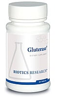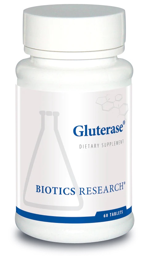 Gluterase® was designed to provide digestive support for those with gluten intolerance or sensitivity. Gluten represents approximately 50% to 80% of the protein found in wheat, barley and rye grains, and primarily due to its rich proline content, is very difficult to digest. It can be found in many different foods as an additive, making it very difficult to avoid entirely, even when trying to follow a gluten free diet. It is for those patients that Biotics Research formulated Gluterase®. Gluterase® provides specific nutrients shown to help digest and inactivate gluten, and at the same time support the health and efficacy of the gastrointestinal (GI) tract. Tolerase® G, a specialized enzyme preparation providing prolyl endopeptidase, has been shown to significantly degrade gluten (Glia-ë±3) in the stomach and duodenum of human volunteers. Tolerase® G is stable and active under gastric conditions and has been shown to be more effective than other commercially available enzymes currently promoted to digest gluten. Gamma oryzanol (from rice) a mixture of sterols and ferulic acid esters. It has been documented to effectively support gastric healing. Okra (Abelmoschus esculentus), provides pectin and mucilage, and possesses antioxidant activity. As a mucilaginous nutrient, it provides significant support to mucous membranes. Marshmallow (Althaea officinalis) extract supports mucosa health. Its polysaccharides possess antitussive activity. Superoxide Dismutase and Catalase (from vegetable culture) are two very important antioxidant enzymes. DOSE: Two (2) tablets with each meal as a dietary supplement or as otherwise directed by a healthcare professional. KEEP OUT OF REACH OF CHILDREN"